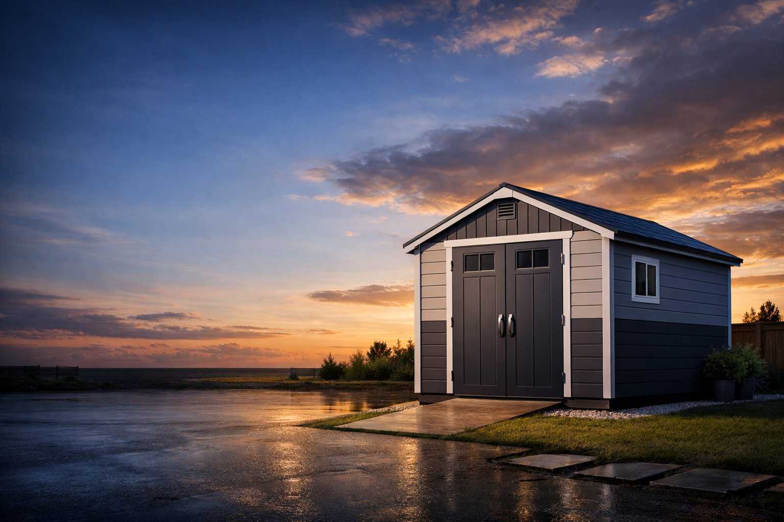 Arrow 10×12 Vinyl Dallas Shed w/ Foundation & Shelving