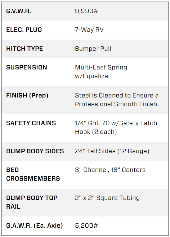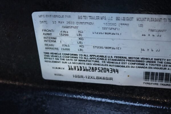 Description BRAND: Big Tex MODEL: 10SR-12XLBK6SIR SIZE: 6 Foot (83in wide) GAWR/PNBE: 2361 KG (5200 LB) GVWR/PNBV: 4535 KG (9990 LB) TIRES: ST235/80R16(E) MANUFACTURER DATE: 05/2022 LOCATION: Main Street Mower – CLERMONT, FL Pro Series Tandem Axle Single Ram Dump Trailer The 10SR from Big Tex Trailers is a medium-duty dump trailer equipped with a straight ram hydraulic lifting system. This unit comes standard with a lockable pump box, combo three-way rear gate and LED lights, and is powdercoated for a long-last build. Have confidence when hauling dirt, gravel, mulch, manure and any other light loads around the home or ranch.