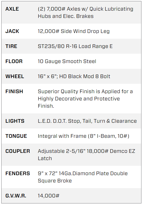 Description BRAND: Big Tex MODEL: 14LP-14BK6SIRPD SIZE: 14 Foot (83in wide) GAWR/PNBE: 3178 KG (7000 LB) GVWR/PNBV: 6356 KG (14000 LB) TIRES: ST235/80R16(E) MANUFACTURER DATE: 03/2023 LOCATION: Main Street Mower – WINTER GARDEN, FL Heavy Duty Low Profile Dump Trailer The 14LP Low Profile Dump Trailer from Big Tex Trailers offers ultra-low profile deck height to make loading and unloading easier than ever. Designed with the user in mind, this unit has an 8-inch I-beam frame.