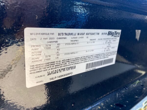 Description BRAND: Big Tex MODEL: 14FT-20BK SIZE: 14 Foot GAWR/PNBE: 3178 KG (7000 LB) GVWR/PNBV: 6356 KG (14000 LB) TIRES: ST235/80R16(E) MANUFACTURER DATE: 08/2022 LOCATION: Main Street Mower – WINTER GARDEN, FL Heavy Duty Full Tilt Bed Equipment Trailer The 14FT from Big Tex is a durable full-tilt deck trailer, perfect for hauling medium-duty, low-profile equipment. This trailer comes standard with an adjustable coupler, LED lights and treated floor.