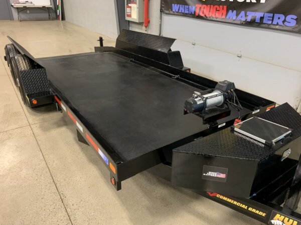 Description 14,000# GVWR Hydraulic Drop Deck Equipment Float Trailer with 78.5″x14’+4′ Deck – Stock Number 34818 Shown with optional Mounted Spare Tire with Cover ($250 value) Standard Features: 14,000lb GVWR 10,150lb Payload Cap. 78.5″x14′ deck + 4′ dovetail 3/16″ Smooth Plate Floor 6” Safety Lip on deck Adjustable Coupler – choice of 2-5/16″ Ball or Pintle 7k Drop Leg Jack Ultra Tough Finish Torsion Suspension 16” On Center Floor Crossmembers LED Rubber Mounted Waterproof Lights (Lifetime Warranty) Checker Plate Pumpbox Interstate Deep Cycle, Reserve Capacity Battery Sealed Wiring Harness (Duraflex Sta-Dry System) 8 – 5/8″ D Rings Popular Upgrades: Additional Length Solar Battery Charger Noco Battery Charger Wireless Remote Control Mounted Spare Tire Alloy Rims 12K Drop Leg Jack Checker Plate Floor Bulldog Winch Winch Mounting Plate Custom Paint Color