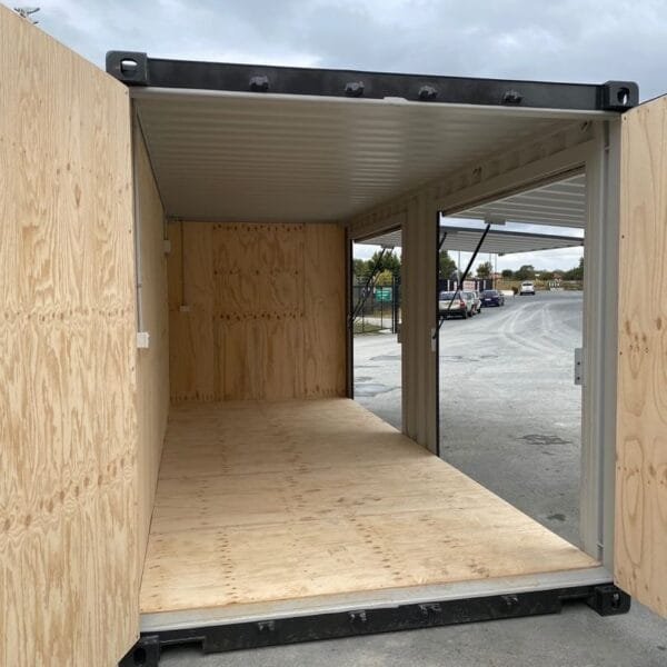 Description Another modified container rolls out of the workshop. This one is heading up to the cape to be used as a laboratory, by local council officers. This is a 20′ standard single use container, fitted out with two stainless steel work stations – with sinks. And in a separate compartment, there is a toilet and shower. The unit is fully insulated, has an AC fitted and vinyl floor throughout.