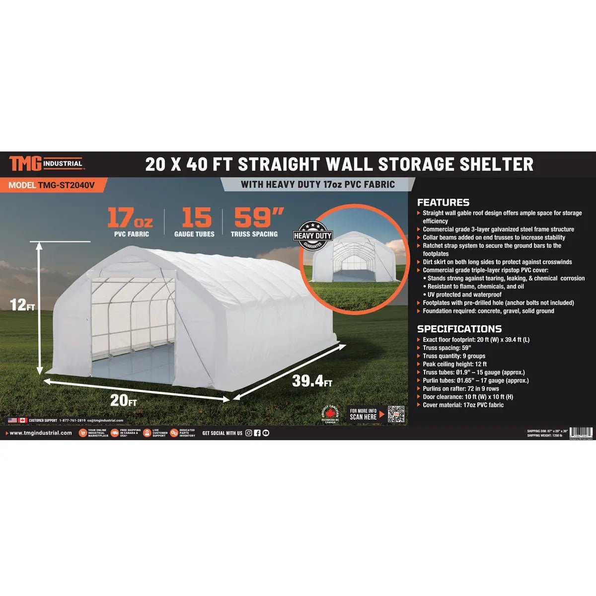 The TMG-ST2041V PVC Fabric Peak Ceiling Storage Shelter provides an easy to assemble, durable outdoor storage solution or workshop for your farm, construction site, equipment dealership and more.