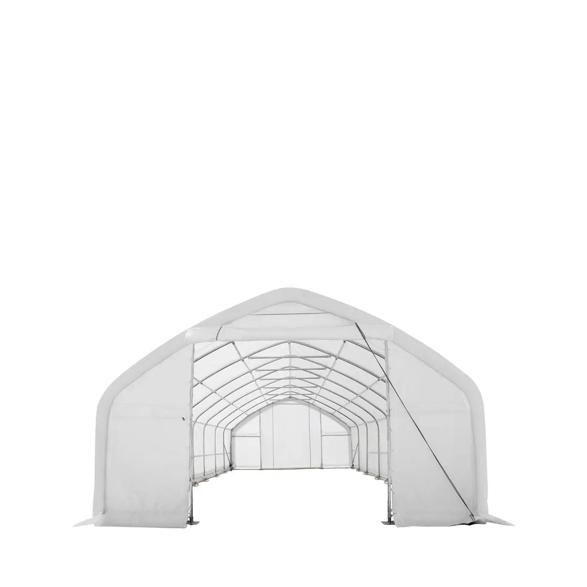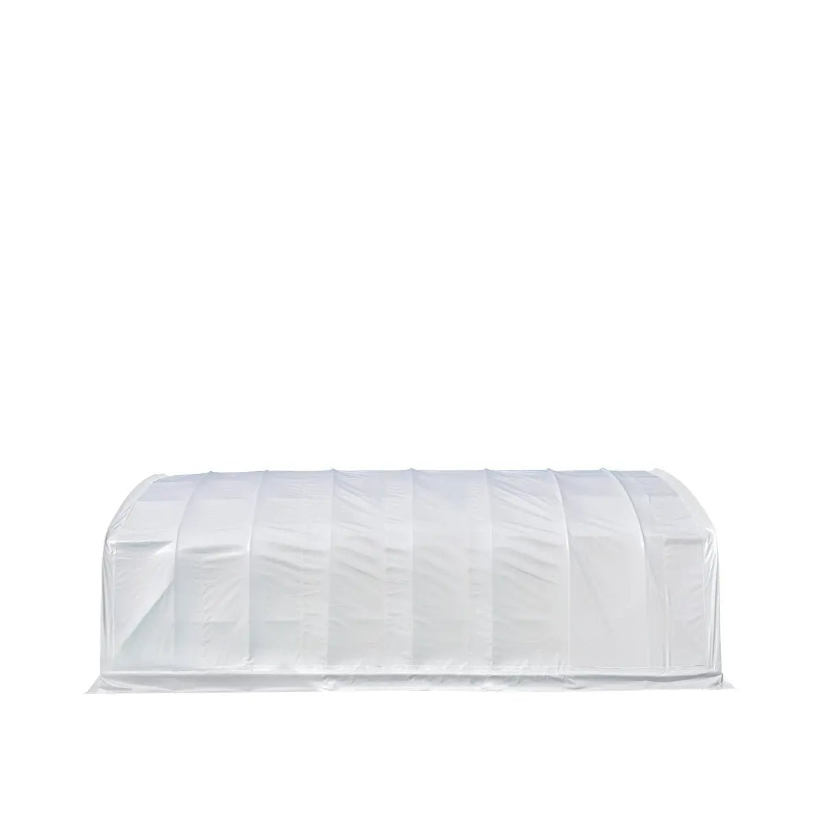 Made of strong, heavy-duty commercial grade polyvinyl chloride (PVC) fabric that is triple layered to prevent tearing and provide a long-lasting shelter covering for many years to come. This fabric is a natural flame retardant, commonly used in large commercial structures such as sports stadiums and event halls. The first 7 ft of each side is a straight wall which amplifies storage space along the edges. 72 roof purlins also run throughout the whole interior of the structure which reinforces it for exceptional durability and stability.