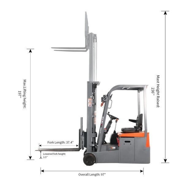 Description EKKO 3-Wheel Lithium Forklift 3500 lbs. 189″Lift EK16A-189LI Product Description The EKKO EK16A-189Li 3 Wheel ELithium Forklift is designed for use for small aisles, limited spaces and budget. It is ideal for loading and unloading trucks, loading docks, stock rooms, manufacturing floors and warehousing. Made from high quality steel and components with durable quality drives to withstand any terrain, usage, impact and directional changes for the use of any application with confidence and assurance. (Recommended for Indoor use on flat surfaces) Load Capacity 3500 lb Raised Height 189″ (15.75ft) Free Lift 31.5″ Adjustable Forks 7.9-26″ Fork Length 42.1″ Zapi Controller Tilt 3/6 Degree 24V AC Drive Motor 3.3 kw Lift Motor Cushion Tires HPS (Hyrdaulic Power Steering) Steel Construction Robotic Welding Charger Included Battery Included Specifications Model EK16A-189Li Lift Electric Drive Electric Load capacity 3500 (lb) Load center distance 24 (in) Wheel base 49.2 (in) Lifting height 189 (in) Free lifting height 31.5 (in) Lowered mast height 81 Mast/Fork carriage tilt forward/backward 3/6 (in) Side Shifting Forks Overall length 65 (in) Overall width 42.1 (in) Fork size, Thick/Width/Length 1.4/4/42.1 Fork adjust width 7.9-26 (in) Turning radius 58.9 (in) Max.gradient performance, laden/unladen 6/10 (%) Lift speed,laden/unladen 4.71/10.2 (in/s) Lowering speed, laden/unladen 11.8/15.7 (in/s) Charger 24V/50A Driving Motor AC Lifting Motor 3.3 (KW) Battery voltage 24V/200Ah Service Weight 4650 (lb)