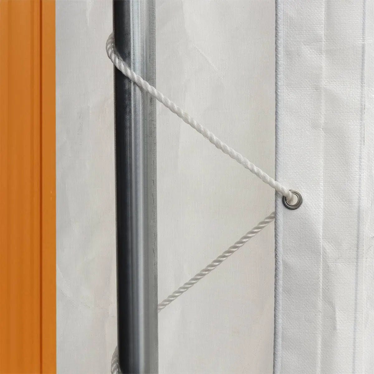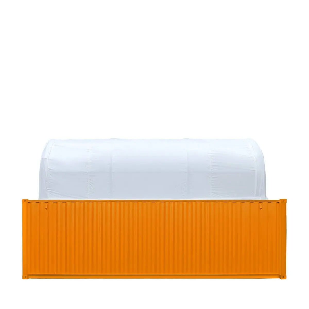 Made of strong, heavy-duty commercial grade polyvinyl chloride (PVC) fabric that is triple layered to prevent tearing and provide a long-lasting shelter covering for many years to come. This fabric is a natural flame retardant, commonly used in large commercial structures such as sports stadiums and event halls. The enclosed end wall and front drop provide an extra layer of protection for your machinery and weather sensitive cargo. Endwall is designed for standard 40′ GP containers; a 14″ base will need to be added if using HC containers.