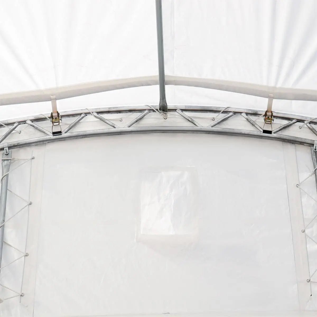 The TMG-DT3020CF Dual Truss PVC Fabric Container Storage Shelter provides an easy to assemble, durable outdoor storage solution or workshop for your farm, construction site, equipment dealership and more. Approximately 600 square feet of covered space to stockpile materials, work on projects, park vehicles and accommodate all other needs big or small. Able to install on any standard containers for versatile usability whether you’re working in remote, rural or industrial locations.