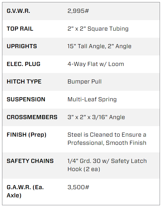 Description Pictured Trailer is a 16’+2.5′ Race Package Model with optional mounted spare tire and removable driver’s side fender Base Package Features: 7,000lb GVWR 5,500lb Payload Capacity 80”x16’ Deck + 2.5′ Dovetail Straight Axles – 23” Deck Height All-Aluminum Construction 2-5/16” A Frame Coupler 2k Drop Leg Jack Multi-Leaf Spring Suspension 4′ Hide Away Ramps 16” On Center Floor Crossmembers Race Package Adds: Drop Axles – 19” Deck Height Galvanized Rims EZ-Lube Hubs All LED Lights w/ Lifetime Warranty Aluminum Toolbox Duraflex Sealed Wiring Harness Recessed D-Rings Popular Upgrades: Additional Length Upgrade to 5 Ton Model Mounted Spare Tire Alloy Rims Pressure Treated Deck Extruded Aluminum Floor Removable Fenders Mounted Winch Adjustable Coupler