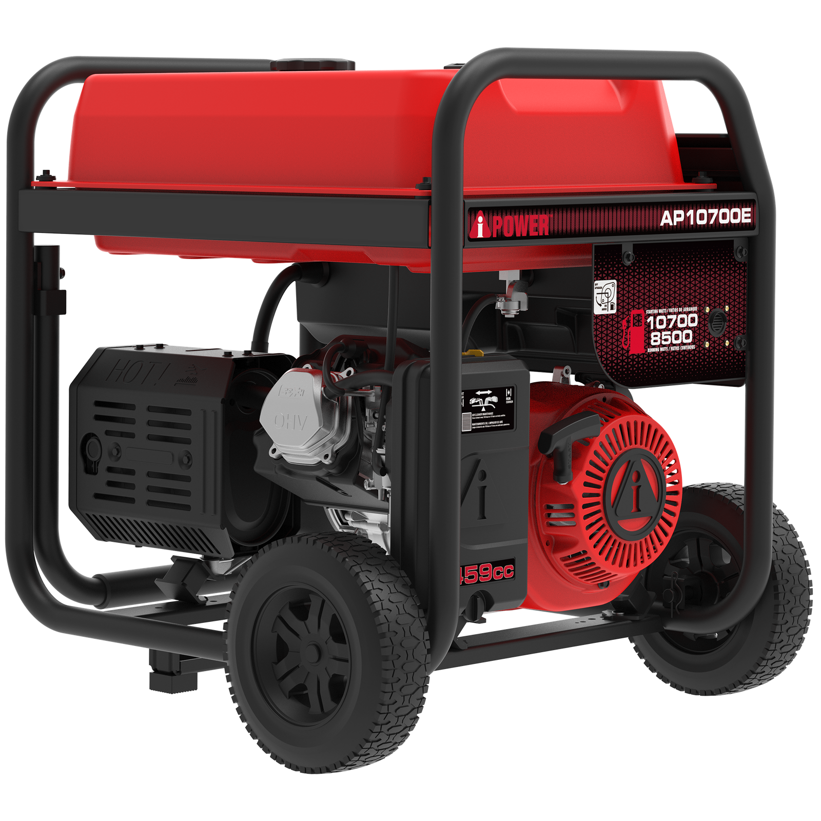The powerful AP10700E 10700-watt extended run portable generator, with a 459cc 4-stroke OHV engine constructed with a durable cast iron sleeve, has 10,700 starting watts and 8,500 running watts. The extra-large 10.8-gallon fuel tank provides up to 22.5 hours of run-time at 25% load.
