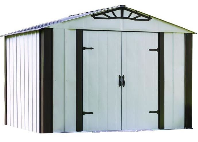 New from Arrow Sheds! The Arrow 10×8 Designer Series steel storage shed kit model DS108. This is a great medium sized shed for putting up in your backyard for extra storage space. It provides a great storage solution for pools supplies, yard tools, mowers or even firewood! Extra wide double swing doors measuring 59.5″ wide allow for easy access. The Designer Series 10′ x 8′ steel shed has appealing aesthetics with decorative trim, accent corner style, ornamental hinges and gable decor. This steel shed makes for an attractive alternative.