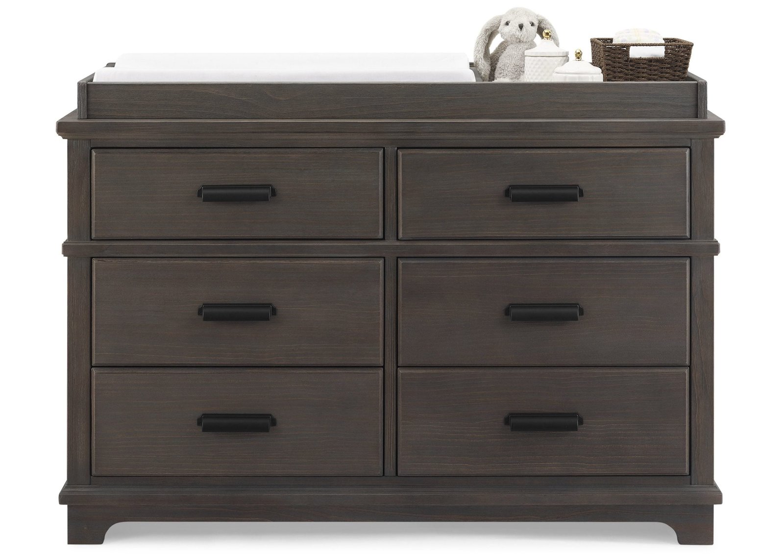 The Asher 6 Drawer Dresser with Changing Top by Simmons Kids adds modern farmhouse charm to any baby nursery or kids’ bedroom. A softy textured, hand applied finish and sleek matte black metal cup handles offer an updated take on rustic design. The Asher 6 Drawer Dresser includes a removable changing top that creates the perfect space for diaper changing now and is easily detachable, so you can create a more grown-up space later on. Pair this dresser with the Simmons Kids Asher 6-in-1 Convertible Crib for a coordinated look. Given the hand applied nature of this dresser’s finish, variations in the wood are to be expected and celebrated.