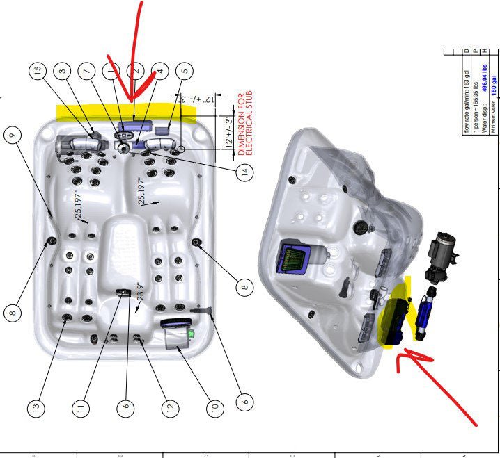 Overall2′ 5 1/2” H X 7′ W X 5′ 3” DInterior Tub2′ 4 3/4” D X 4′ 2 2/5” X 5′ 3 43/50” WSeat/Bench1′ 9 21/50” H X 1′ 5 12/25” W X 1′ 11/25” DProduct Weight When Filled2645.6 lb.Overall Product Weight429.9 lb.