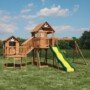 Elevated Adventure: Spacious raised clubhouse with a wooden roof, balcony, windows, and a connected elevated playhouse is perfect for outdoor play