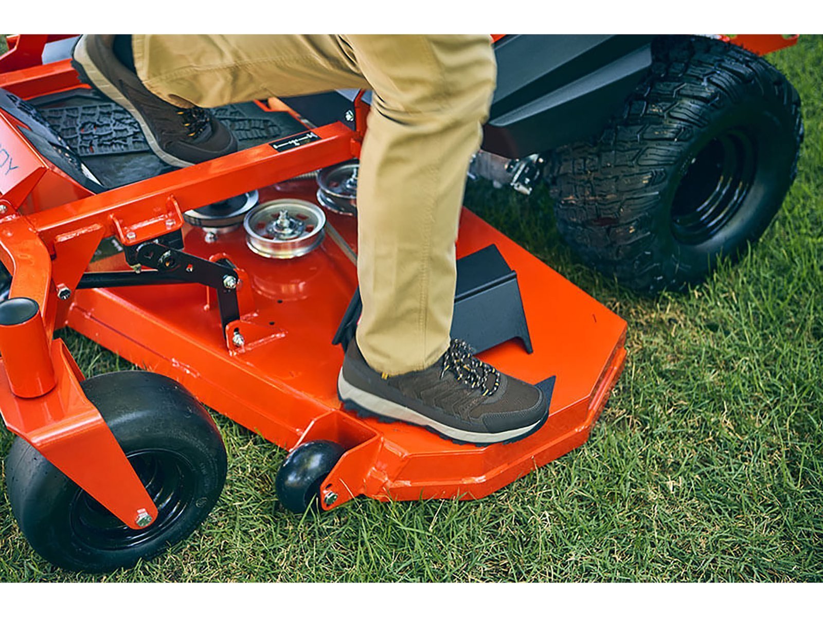 Deck size: The durable sixty inch deck, constructed from 7-gauge steel with a three-sixteenth inch base and additional one-fourth inch side plate, offers unmatched durability and a superior cut quality.