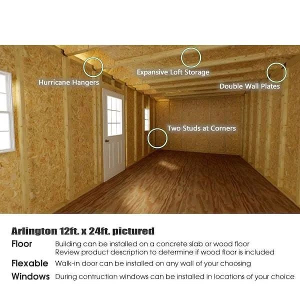 Assembly Required Yes Capacity (cu. ft.) – Total 2400 cu ft Color Family Clear Door Type Double Features Door Latch, Double Door, Lockable Door, Loft, Shutters, Single Door, Windows Floor Options Without Floor Foundation Foundation Not Included Included No Additional Items Included Manufacturers Recommended Assembly Time (hours) 96 Manufacturers Recommended Tools needed for Assembly Safety Glasses, Hammer, Screwdriver, Level, Ladders, Tape Measure, Square, Drill, Circular Saw Maximum Roof Load 40 Maximum Wind Resistance 130 Number of People Recommended by Manufacturer to Assemble 3 Number of Windows 5 Product Weight (lb.) 2100 lb Returnable 90-Day Roof Color Family Clear Roof Material Wood Roof Material Not Included Roof Pitch 10/12 Roof Shape Peak Shed Type Wood Siding Color Family Gray Storage Capacity (cu. ft.) 2400 Style Ranch Warranty / Certifications