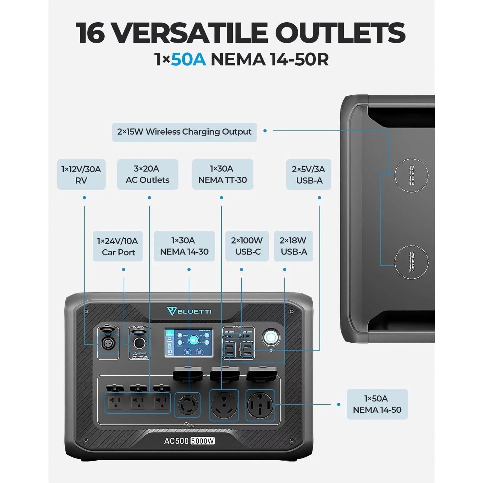 The NEMA 14-50R, TT-30, and L14-30 ports are perfect for heavy-duty appliances. Just plug in what you want to charge, and AC500 will do the rest for you.