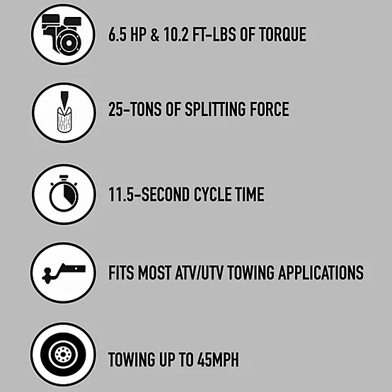 CountyLine 25-Ton Log Splitter uses a 265 Kohler SH Series engine which is known for having both industry-leading power and a user-friendly design. The Kohler has an accessible air filter and sparkplug, making it extremely easy to maintain, and a dual ball bearing crankshaft design that makes starting up a breeze.