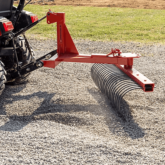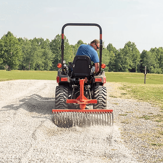 Rake twigs, leaves and other items easily with the CountyLine Sub-Compact Landscape Rake. This impressively durable steel landscape rake is 4 ft. wide and conveniently attaches to your tractor. This 4 ft. implement’s curved steel tines easily clear rocks, roots and other debris. Choose where the debris lands by switching up the angle of the rake. A powder-coat finish protects the rake from the wear and tear of each use.