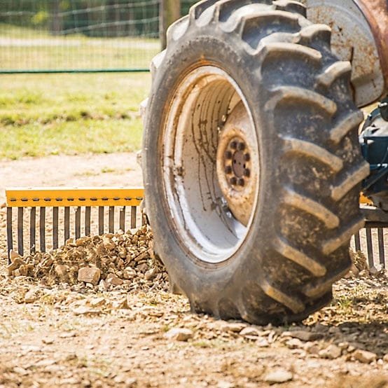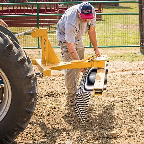 Smoothen and contour soil surfaces easily with the CountyLine 6 ft. Landscape Rake. Featuring a 360 degree rotation with 5 forward and 5 reverse settings, this yard rake is designed to be both pulled or pushed. It works on 19-45 HP tractors and is made with replaceable high-carbon curved tines. Use with or without optional wheel kit. Includes category 1 pins.