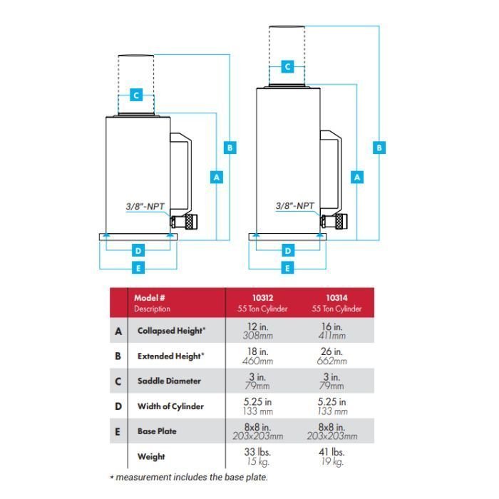 The ESCO Professional Aluminum Jack Cylinder Series is designed for high-capacity, precision lifting applications. The Heavy-Duty construction provides longevity and reliability when faced with continual use in the shop or field. The ESCO 55-Ton Jacks are ideal for technicians who work on large equipment including trucks, tractors, mining, and construction equipment.