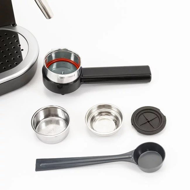 The Carezza’s specially designed Crema Perfetta double-walled pressurized portafilter is specifically designed for use with ESE pods and ground coffee, eliminating the need for a grinder. Tamping isn’t necessary either, but our tests found that a light tamp can really improve your shots.