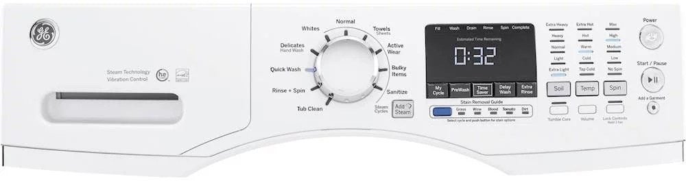 Take control of laundry chores with this GE front-load washer. Its Tumble Care setting automatically spins forgotten loads every eight hours, and its Steam feature helps loosen tough stains from fabrics for cleaner results. This 4.5 cu. ft. GE front-load washer has a short cycle option that provides a full load of clean clothes in 37 minutes.