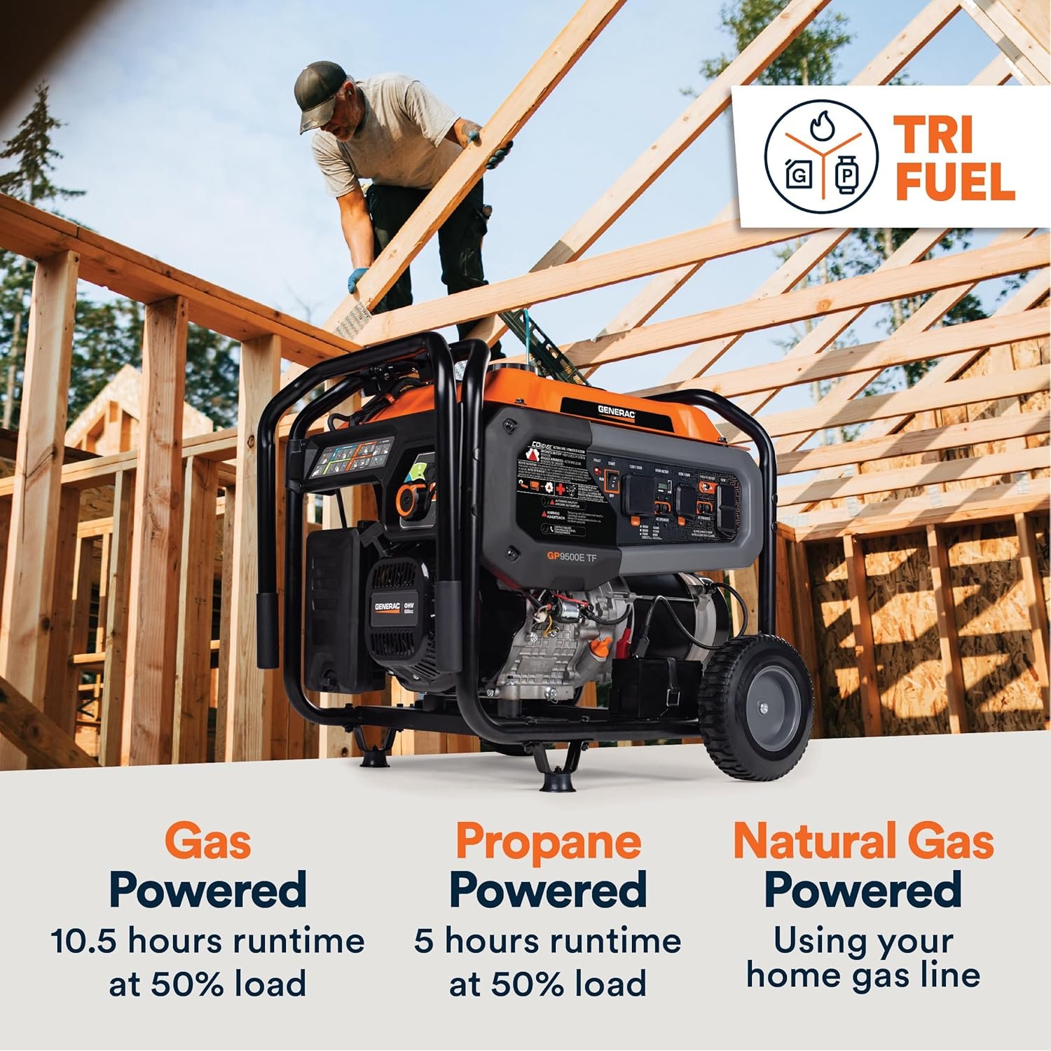 • Built for Durability – Rugged design with covered outlets, 1.25-inch steel-tube cradle, and heavy-duty, never-flat wheels for long-lasting performance and easy transport across tough terrain.