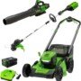 Combo Kit offers 3, must have, outdoor tools for your lawn care needs. Greenworks delivers the ultimate battery-powered Self-Propelled Lawn Mower. Quickly mow up to half an acre on a single charge, then fully recharge battery in just 60 minutes. This lightweight, quiet-running self-propelled, rear-wheel-drive mower has variable speed control for mowing at comfortable speeds; SmartCut Technology that constantly monitors grass conditions, then automatically adapts to provide the perfect amount of power needed to get the job done; and cutting blades that wont bog down in tall, wet, or thick grass. Heavy, wet leaves and other stubborn debris are no match for the Greenworks 80V battery powered brushless Handheld Leaf Blower. The jet fan design provides up to 730 CFM of constant airflow for blasting through heavy, wet leaves and tough debris with ease; and a variable speed trigger delivers on-demand power and up to 170 MPH of high-velocity air speeds. Its one of the most powerful battery-powered handheld blowers in the industry, with Greenworks exclusive Intelligent Power that combines TRUBRUSHLESS motor technology, lithium-ion battery power, and ultra-fast control systems for power output equivalent to a 26cc gas-powered motor. Enjoy constant, fade-free power with the battery-powered Greenworks 80V 13brushless String Trimmer. With high and low speed settings and a responsive variable speed trigger for on-demand power, you can choose the best cutting power for the job. Plus, load-sensing technology automatically provides more power when needed, and never bogs down. The Load NGoTM trimmer head makes cutting line reloads a breeze, and the bump-feed feature means quick, easy line advancements on the fly. Includes 4 Ah battery and charger. Battery is compatible with 75+ Greenworks 80V products. Life. Powered. By Greenworks.