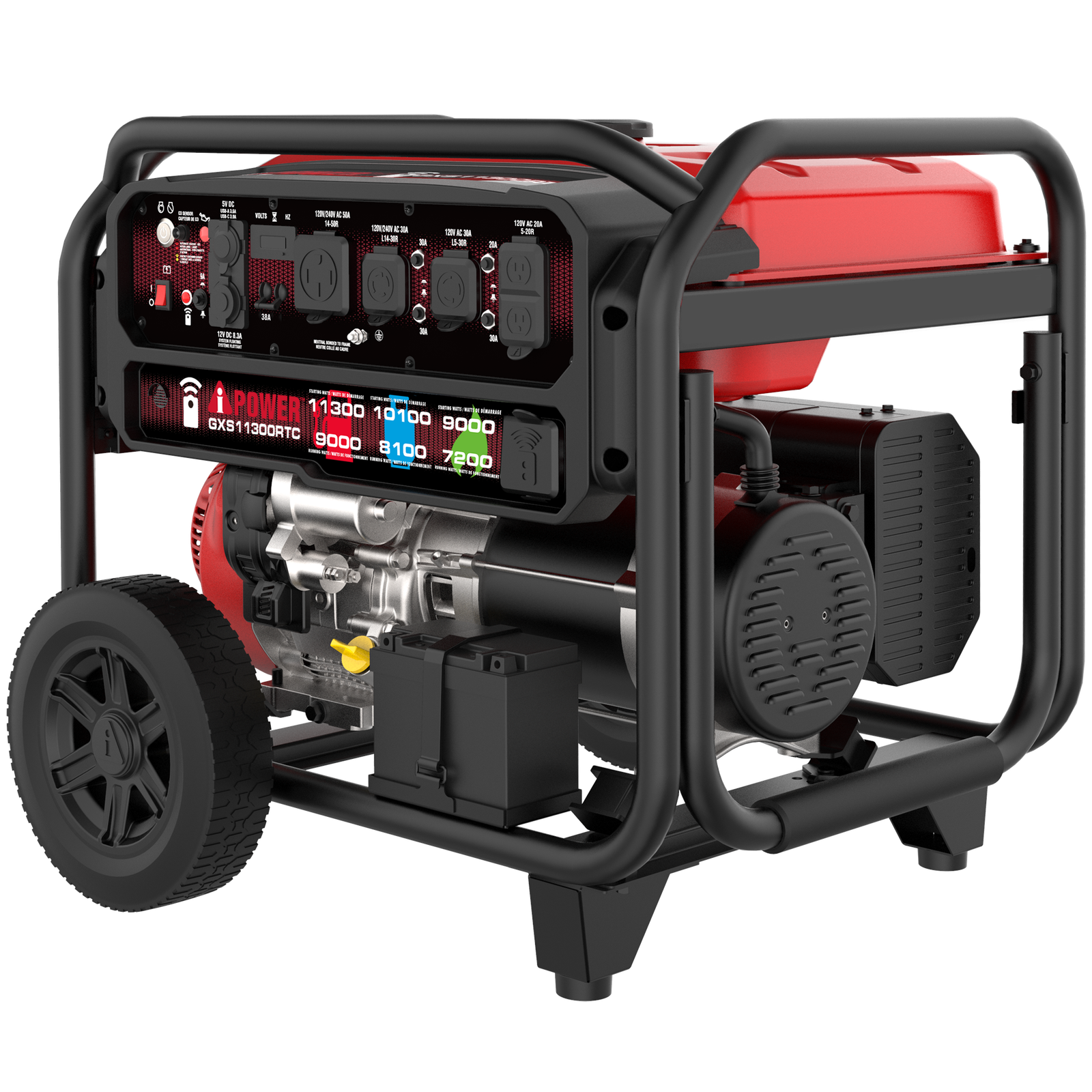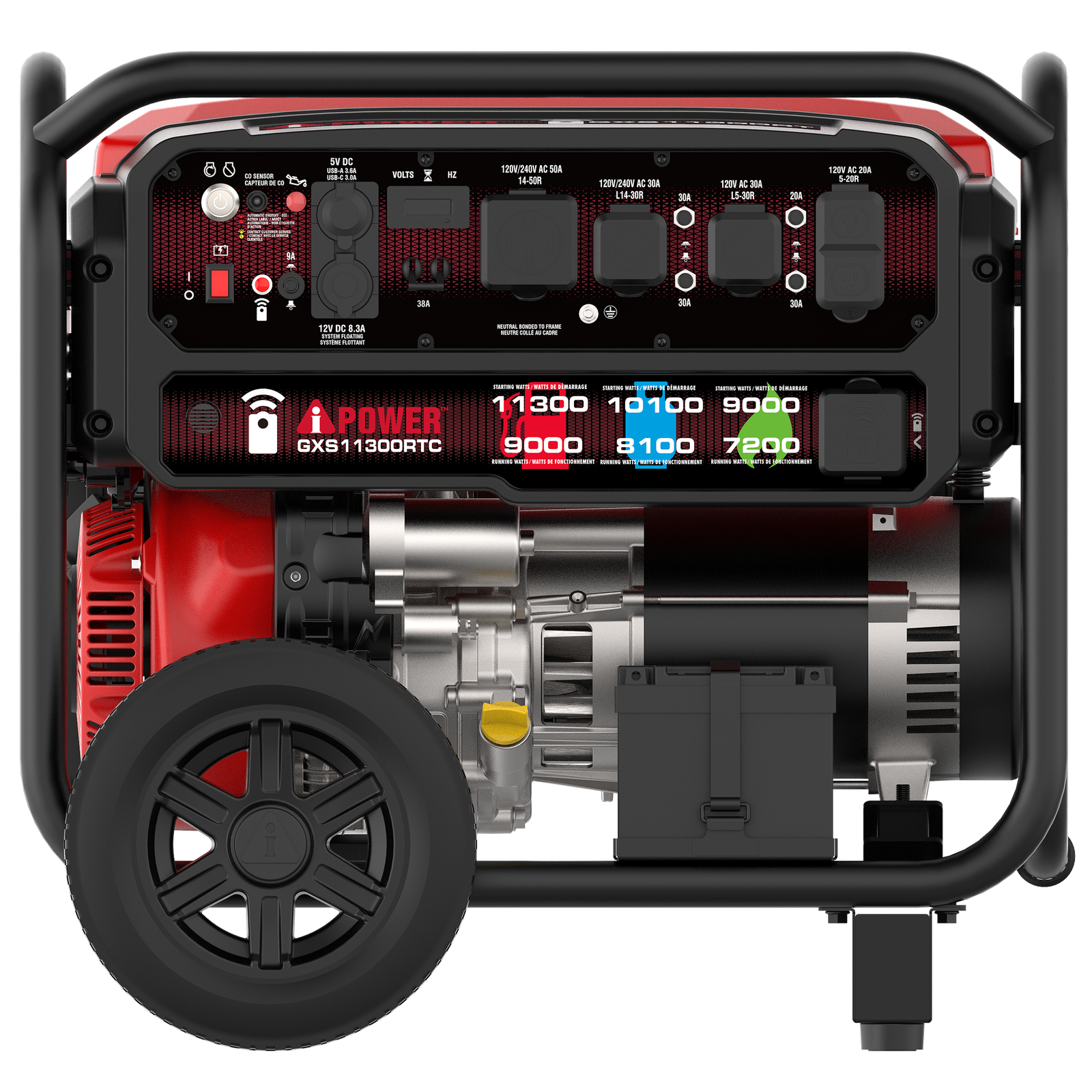 The easy-to-transport generator has a folding handle and wheels included, a CO Sensor with auto shutdown that monitors and reacts to carbon monoxide (CO) levels, and has recoil, electric, and remote start, with the fob and battery included.