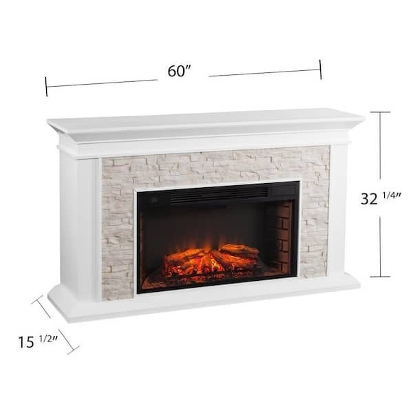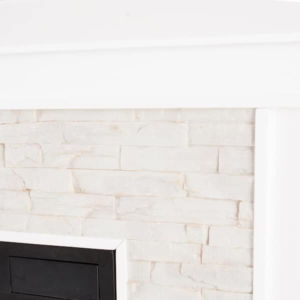 Western romanticism warms to life in this striking electric fireplace. Crisp white finish, subtle woodwork and rustic white simulated stacked stone encases the firebox. Extra wide fireplace ignites the senses; cozy heat fills great rooms and reading nooks alike, wowing any crowd. Conjure the ambience of a blazing hearth in an entertaining parlor, living room or dining area with this stunning, traditional fireplace. Energy efficient LED bulbs light the fire, a cost effective way to ignite bliss in any room without professional installation. User friendly remote control offers 4-way adjustability to customize the widescreen fireplace from the comfort of your sofa. Flames and logs harmonize with 5-level adjustment, plus optional down light illumination. An automatic shutoff and glass that remains cool to the touch ensure the fireplace warms safely. Turn off the heat to enjoy the fireplace ambience year round.
