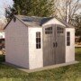 The 10-foot wide Sheds from Lifetime Products give you that extra space needed while accenting the beauty of your backyard. The centralized location of the doors provides easy storage access and the decorative shutters, molded wood-grain panels, and simulated shingled roof ensure an attractive design that will be the envy of your neighborhood.