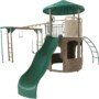 The Adventure Tower Deluxe Playset from Lifetime Products is full of exciting activities for children of all ages. Constructed of UV-protected high-density polyethylene (HDPE) and powder-coated steel, it’s durable, weather-resistant, and will not warp, rot, crack, or splinter. From the swing set and slide to the rock climbing walls, your kids will have no problem finding plenty of features to keep busy with. So let your kids enjoy the features and activities while you enjoy the low-maintenance and safety of a Lifetime Playset. Features 5′ tall decking with hard top clubhouse, sandbox, (2) doors, (4) storefronts, (2) rock climbing walls, (1) 9′ wavy slide, (1) steering wheel, (1) trapeze, (2) chalk boards, (1) arched climber, car map, (2) swings, monkey bars, and (1) fireman pole. This model comes in earth tone (green, brown, tan). Great for 3 to 12 year olds and can handle up to 10 players. 5-year limited warranty.