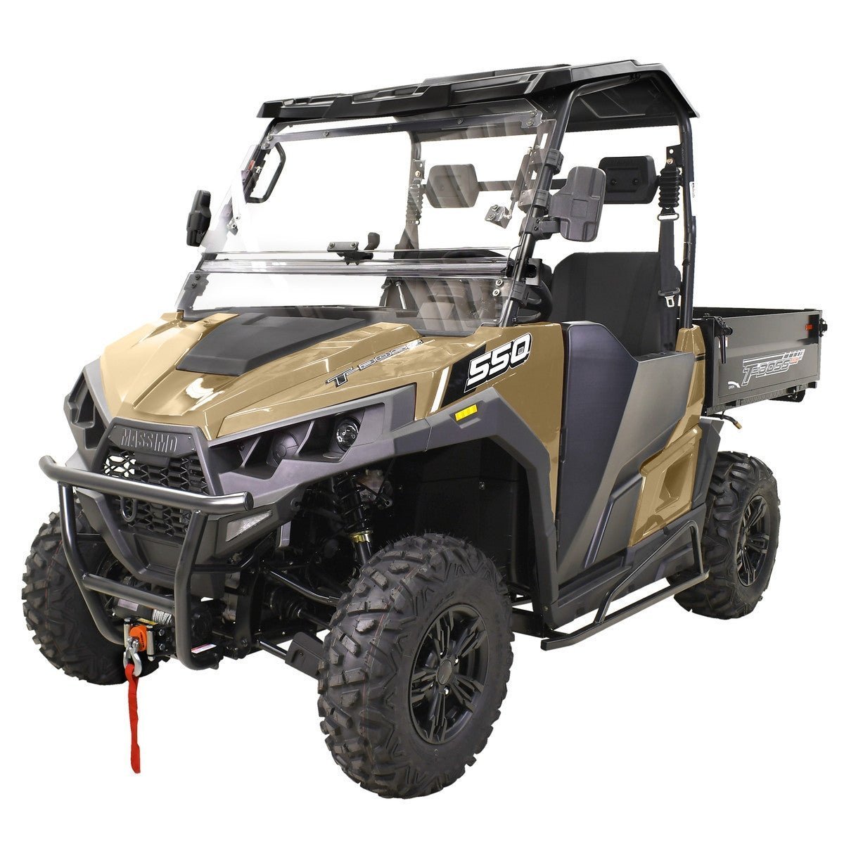 Discover the T-Boss 550, exclusively available at Tractor Supply Store, where performance meets unmatched value. Featuring Best in Class Value, the Highest Resell Value in its class, and the Most Included accessories than any other model in its class, making it the smartest investment for your lifestyle. This UTV is the most feature-packed option on the market, offering a robust 493cc EFI engine with 33 HP and speeds up to 45 mph. Built for both work and play, its CVT transmission and selectable 2WD/4WD ensure smooth handling on any terrain. With a 3000 Lbs. Winch rating, 1200 lb. towing capacity and a 330 lb. cargo bed, the T-Boss 550 is a true workhorse, ready for any task you throw its way. The double A-arm suspension provides a comfortable ride, while the 6.9-gallon fuel tank allows for extended adventures. Enjoy peace of mind with a standard One Year Limited Warranty and top-rated support through our network of over 1,000 service centers nationwide. For any assistance, our dedicated customer service team is just a call away on 1-877-881-6376. The T-Boss 550 is not just a vehicle; it’s a game-changer for nearly any type of riding.
