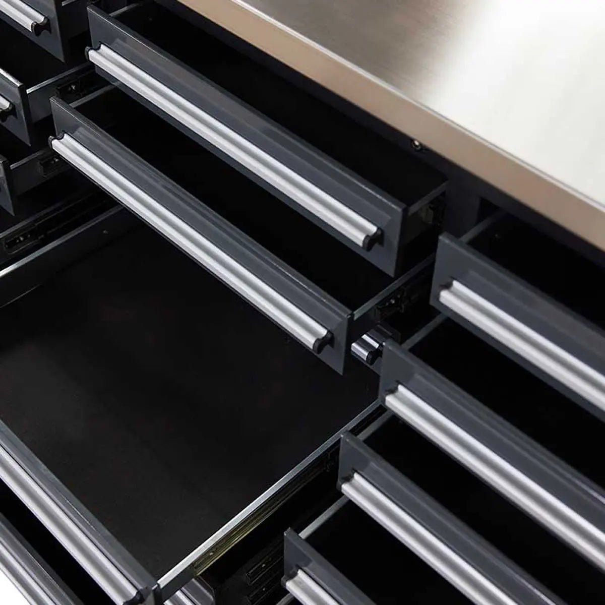 Powder-coated for extra durability and equipped with smooth-gliding ball bearing rails, this workbench is designed for professionals who value quality, function, and mobility. Built for professionals who demand strength and reliability, this workbench is perfect for garages, workshops, and industrial spaces.