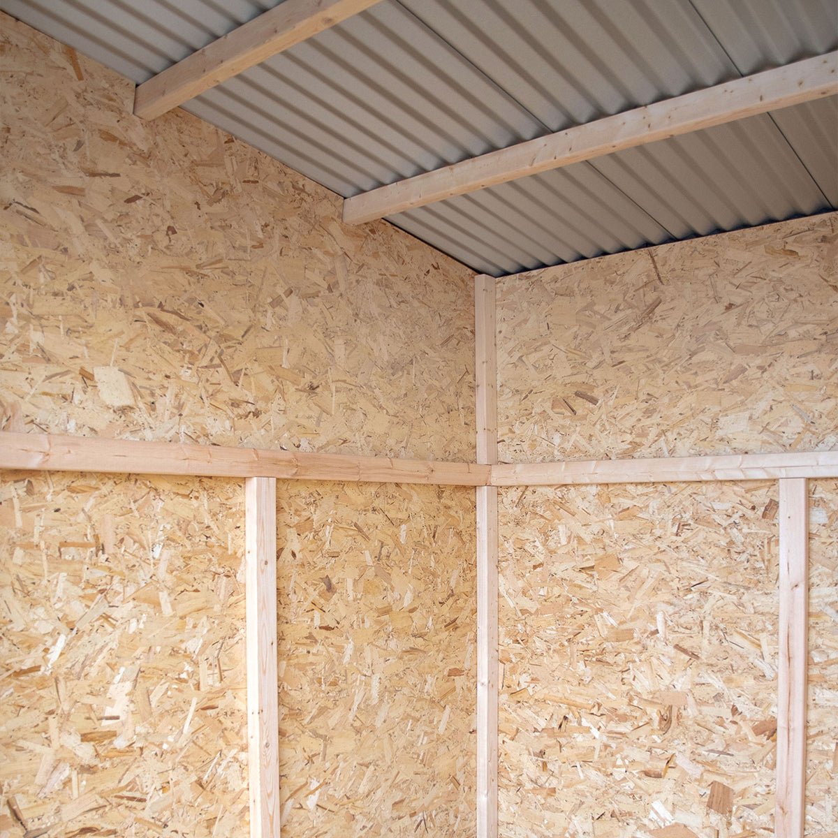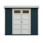 The Sherbrooke Shed offers modern design with durable, weather-ready features. Measuring 8′ x 6′ (48 sq. ft.), it includes a Palram® Suntop® polycarbonate roof for superior weather protection. The 7-foot tall front wall and 6-foot tall back wall easily accommodate long-handled tools, while 48-inch wide double doors provide easy access to equipment. Two transom door windows allow natural light inside, and a locking T-handle with two keys keeps your belongings secure. Build it yourself to save or choose professional installation for a hassle-free setup.