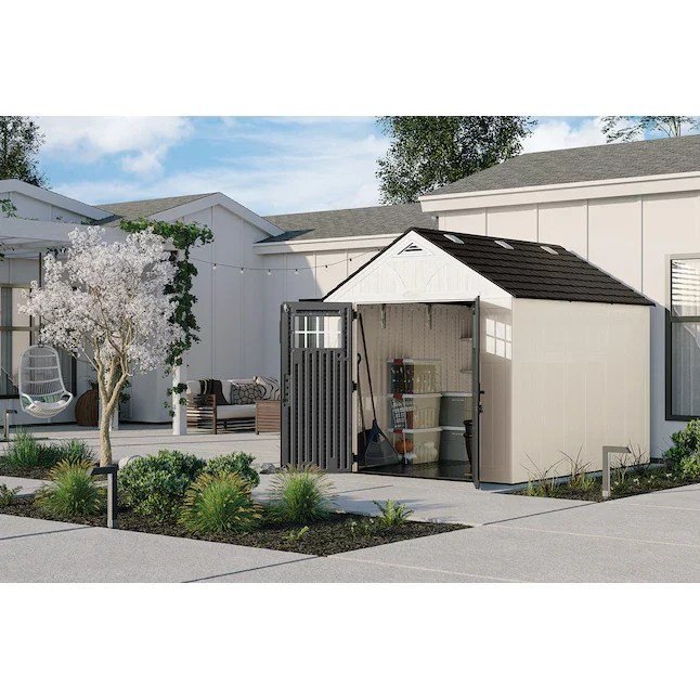 The 8 ft. x 10 ft. Tremont® storage shed with the new trend-forward color pallet by Suncast® can tackle all your storage needs. The reinforced resin floor is built to withstand heavy loads, such as lawn mowers, tractors and other large outdoor equipment. In addition, utilize every inch of space with the included standard corner shelves. Built-in skylights allow natural light to come in making it easier to locate items during the daytime. The large double-door entry way provides easy access to your belongings and is equipped with pad-lockable metal handles to keep them safe and secure (lock not included). Constructed of metal reinforced, multi-wall resin panels, this sturdy shed is weather resistant and easy to maintain from season to season.