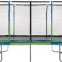 Safety enclosure net, enclosure poles, and thick trampoline safety pad provide ideal safety